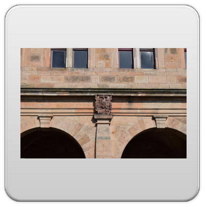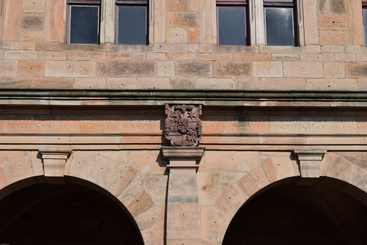 Am mittleren Pfeiler des offenen Erdgeschosses finden wir das steinerne Wappen des hessischen Landgrafen Ludwig des Vierten, der in Marburg von 1567 - 1604 residierte.